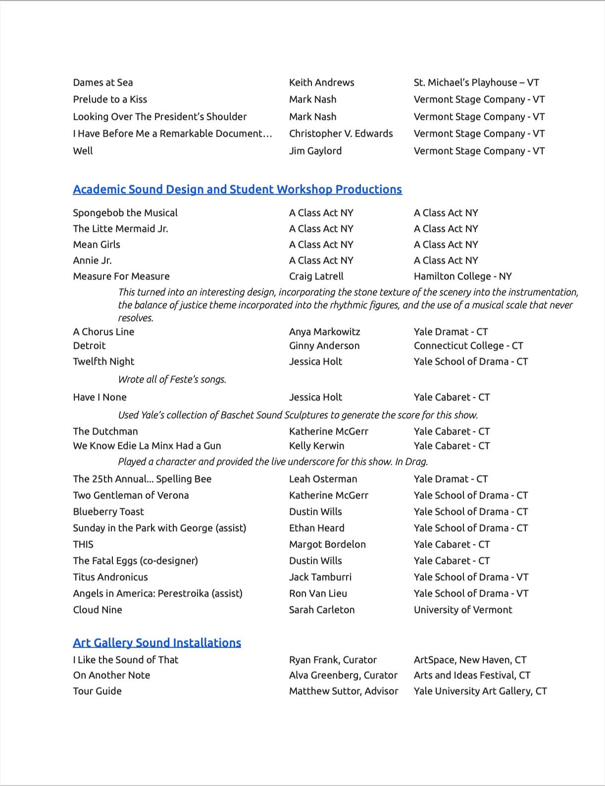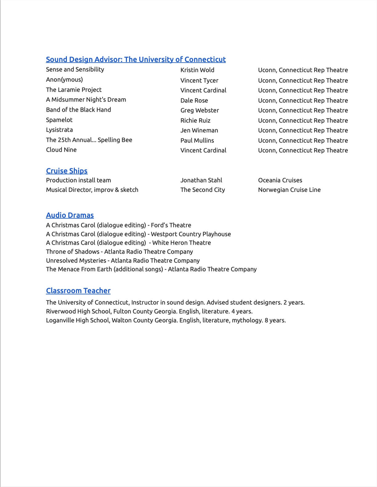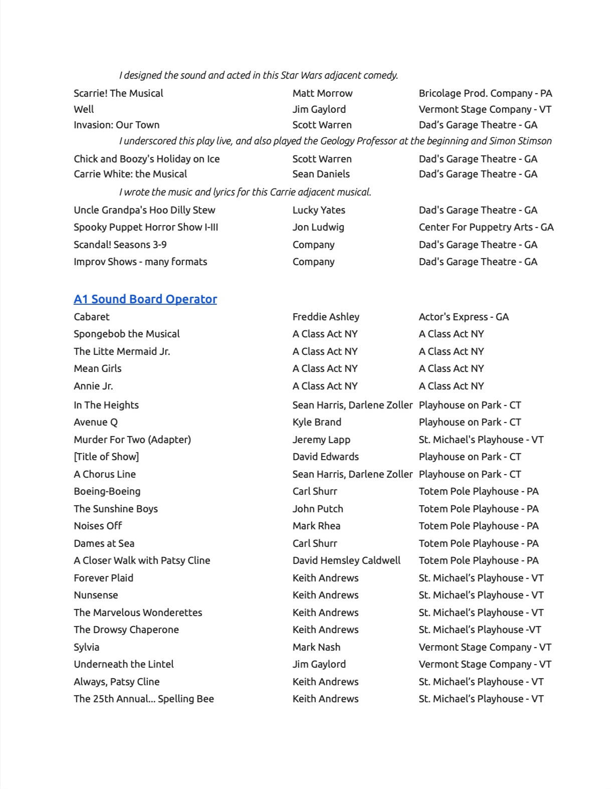 Joel Abbott is a theatrical sound designer who has been designing shows since 2000. Originally from Atlanta, he began his career as a musical improviser at Dad’s Garage Theatre, creating live music for thousands of improv performances. He attended the Yale School of Drama and has worked professionally in theatre ever since.